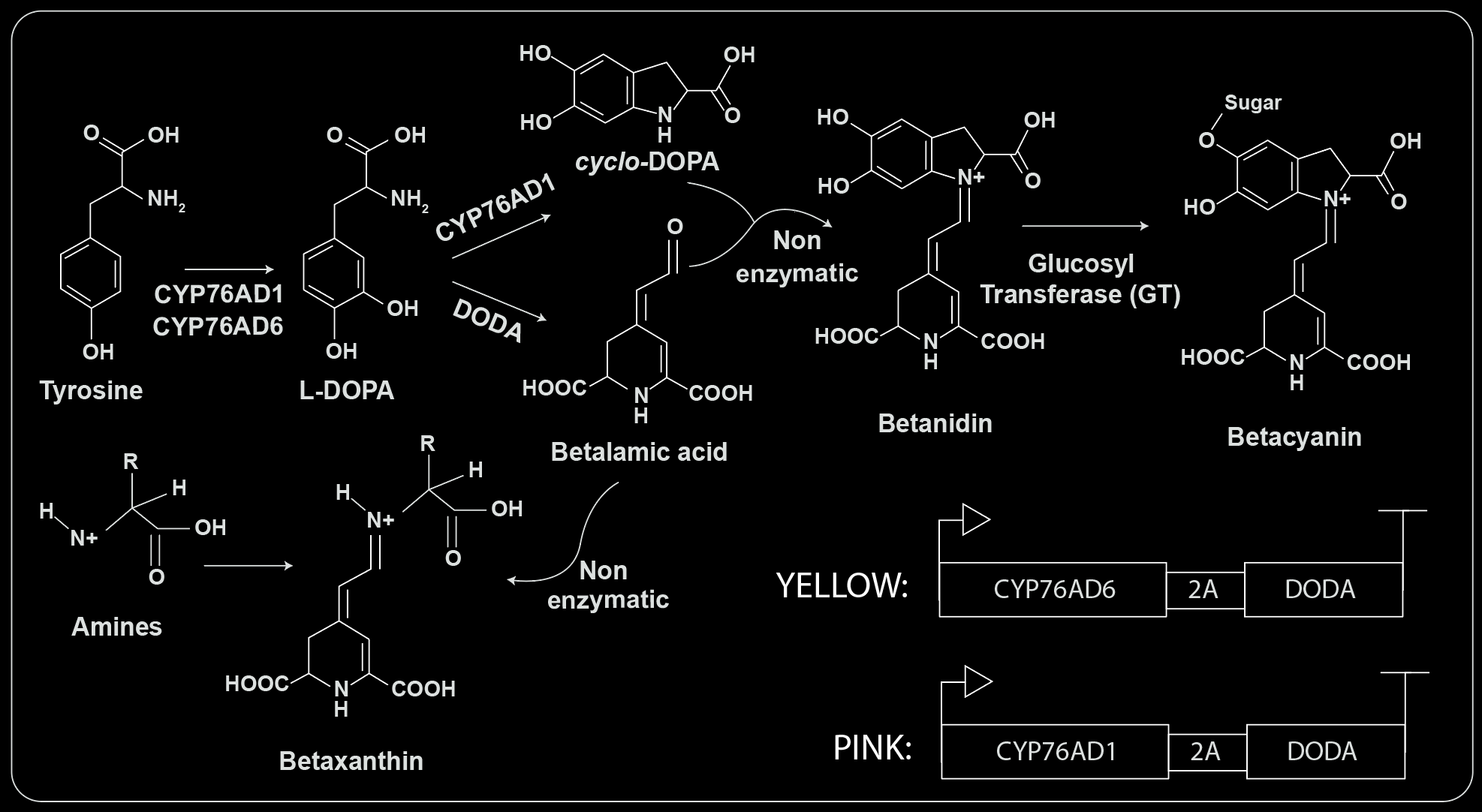 Flower color can be programmed using genes encoding enzymes of the betalain and anthocyanin pathways or other genes which regulate pigment synthesis.